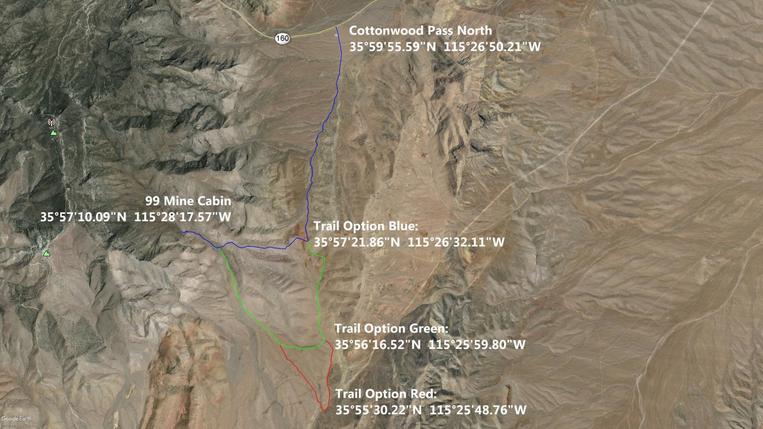 Option 1: Shortest route, but more difficult approach. 35°57'21.86"N 115°26'32.11"W